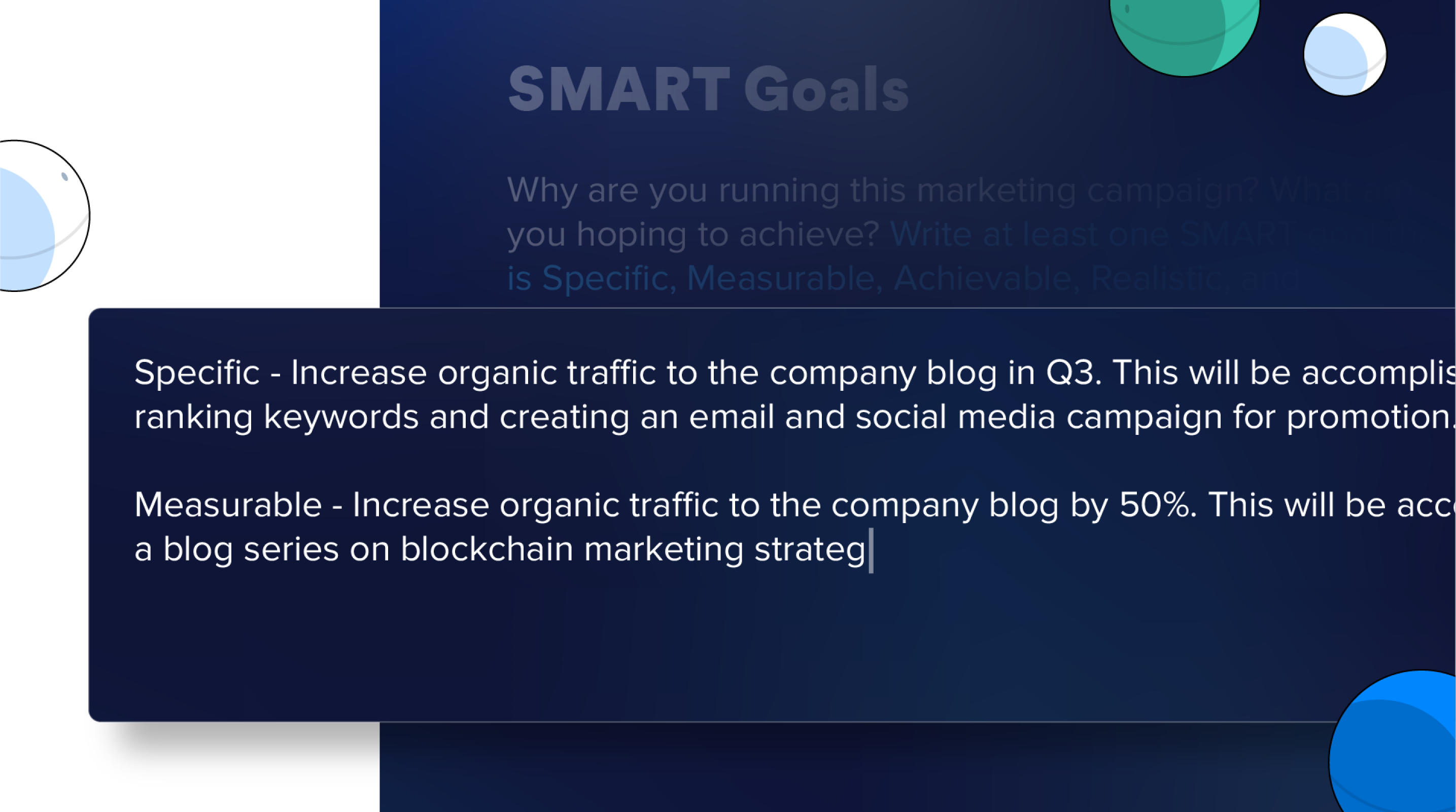 Set specific, measurable, attainable, realistic, time-bound goals, and list the metrics that will help you determine if your blockchain marketing campaign was a success.