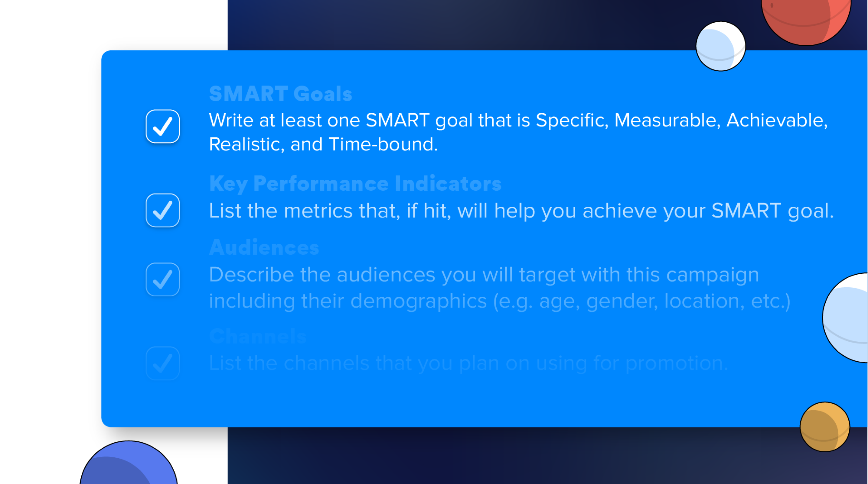 Collaborate with your team to generate winning ideas and list the creative assets needed to successfully execute your campaign.